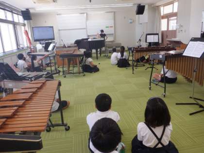 4年音楽の学習です。「茶色のこびん」の合奏ですが、それぞれの楽器で出す音の「高さ」「強さ」「音色」を工夫しようとしています。