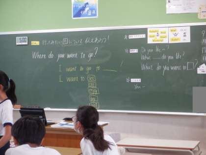 6年外国語の学習です。Where do you want to go?(どこに行きたいですか)を使って、行ってみたい国について伝えあう学習です。