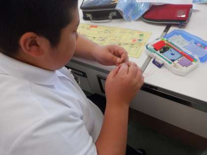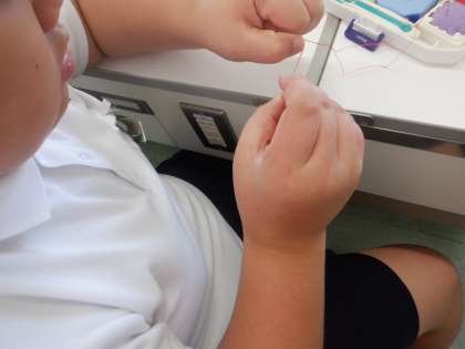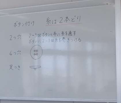 5年家庭科の学習です。ボタン付けをするので、糸は「2本どり」(2重)にします。2本の糸でもうまく玉結びをしています。
