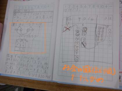 この人は146を100と46、ひく数89を80と9に分ける「サクランボ」方式で答えを出しましたが、右のページでは位取りの図をかいて答えを確かめています。よく考えています。
