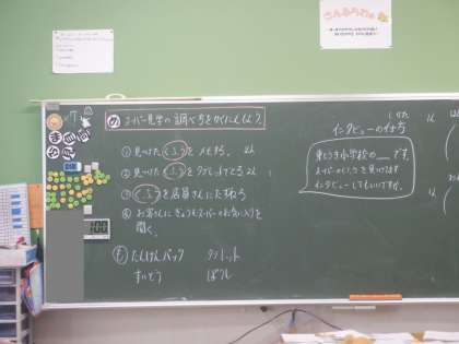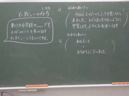3年社会の学習です。このあと、スーパーを見学してお店の方にインタビューをするので、その練習をしています。