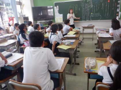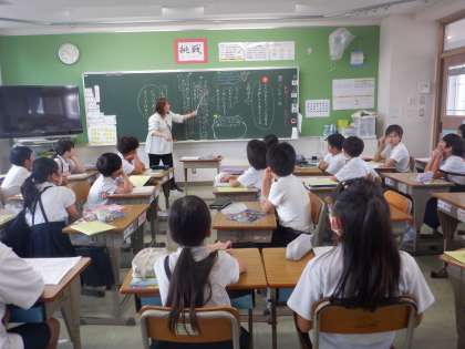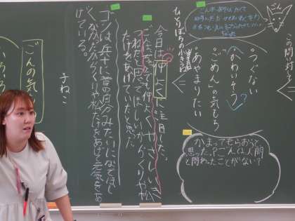 4年国語の学習です。物語「ごんぎつね」を、各自が問いをもって読み進めています。「ごん」の行動にこめられた思いについて、全体で理解を一段深めようとしています。