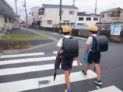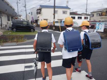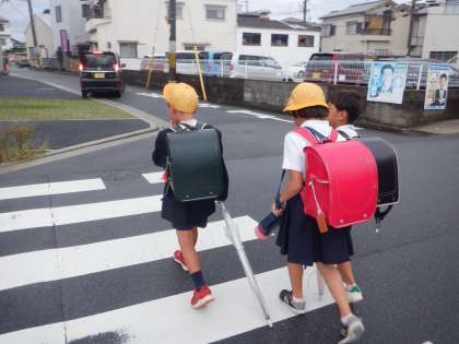 今朝の登校の様子です。雨はやんでいますが、今にもふってきそうな天気です。