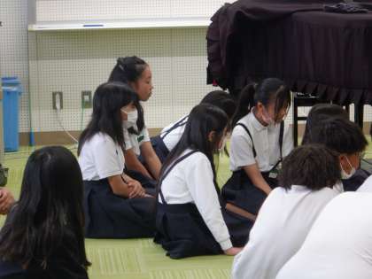 5年音楽の学習です。去年の5年生(今の6年生)の連音本番の歌声を聞いているところです。