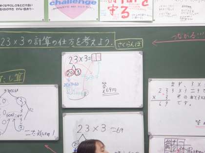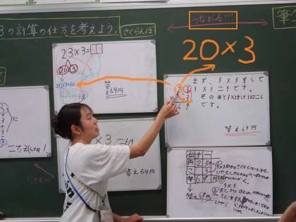 23を20と3に分け、それぞれに3をかけてたす「サクランボ」方式が、ひっ算と同じ考え方であることに気づきました。