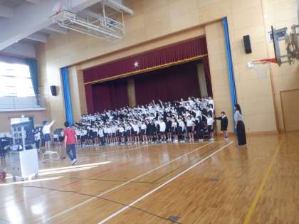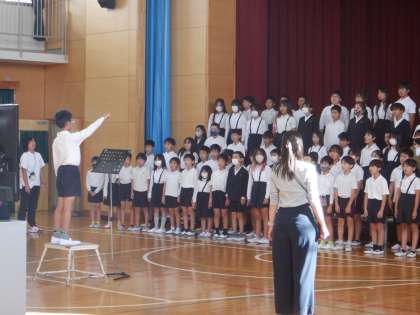 連合音楽会をめざしている5年生の練習の様子です。今日も、発声練習は指揮に「立候補」した人が進めています。