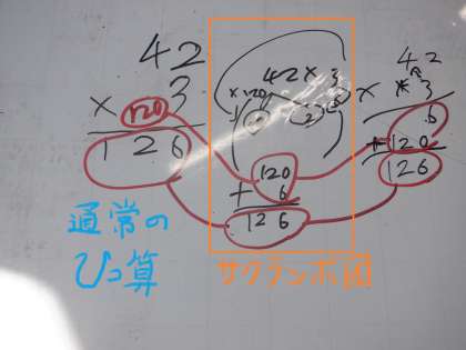 サクランボの図を中心に、一の位と十の位を分けて書くひっ算と、通常のひっ算との関連がわかるように表しています。