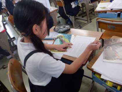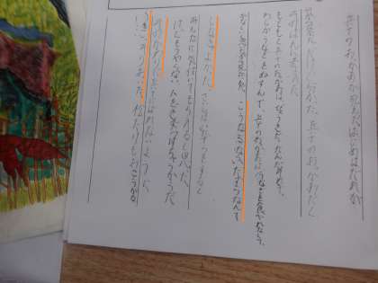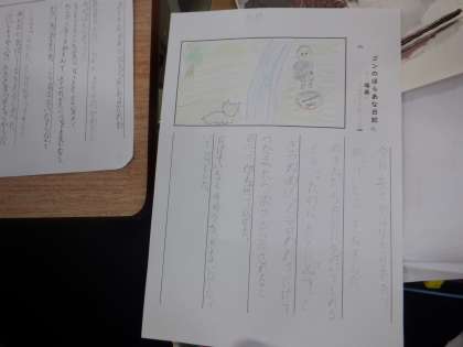 4年国語の学習です。主人公である「ごん」の気持ちをとらえるため、「ごんのほら穴日記」をワークシートに書いています。