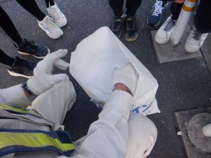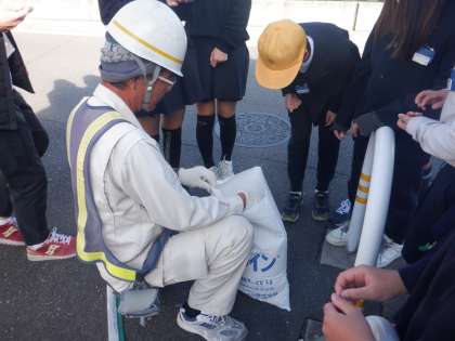 溶けて色がつくまえの「原料」を見せていただきました。白い粉末状のものでした。