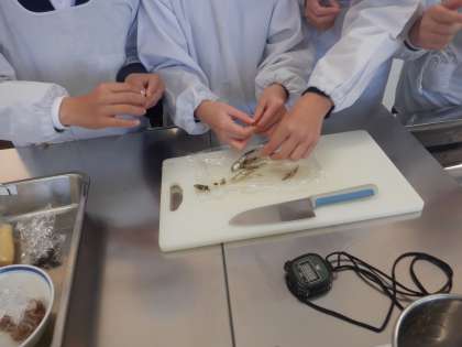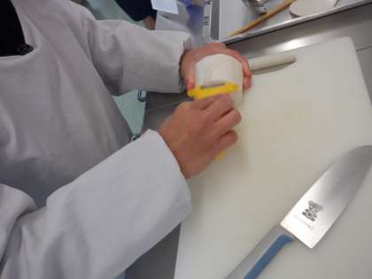煮干しでだしをとりますが、まずは頭とはらわたを取り除きます。大根の皮はピーラーでむきます。