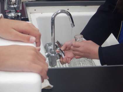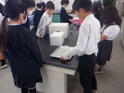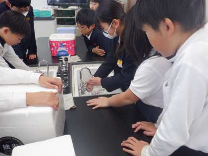 丸底フラスコに水を入れ、ガラス管つきのゴム栓をはめれば、実験準備完了です。