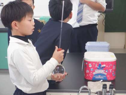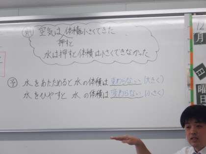 しるしをつけたところより水が上がれば体積は増え、下がれば減ったことに、位置が変わらなければ体積は変化しなかった ということになるのを確認しました。