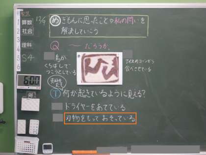 5年4組 社会 メディアとどう関わるか 3 公開日 2024/12/09 更新日 2024/12/09 5年 いろいろな見方がありましたが、向かって左側の人が、刃物で右側の人を襲っているところに見える人が多くいました。