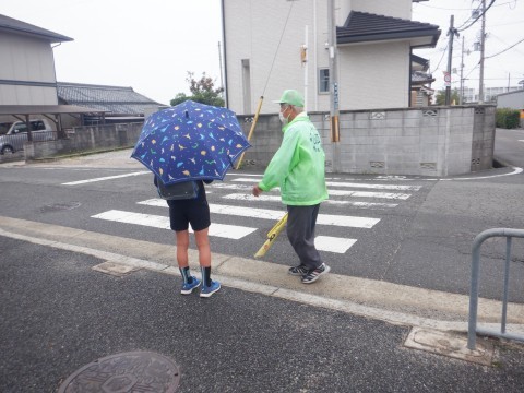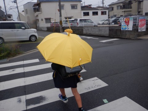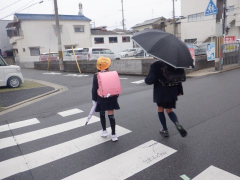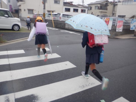 今朝の登校の様子です。冬のはしりのような冷たい雨が降る朝です。