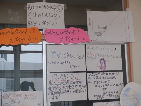 理科室の前に,5年生がヒトの誕生の学習で作成した成果物を展示しています。