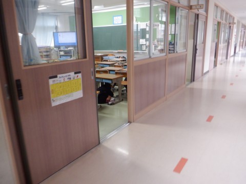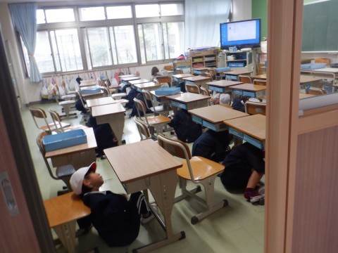 大阪880万人訓練に合わせて,避難訓練を行いました。地震の揺れがおさまり,避難の指示が出ました。机の下から出て避難を開始します。