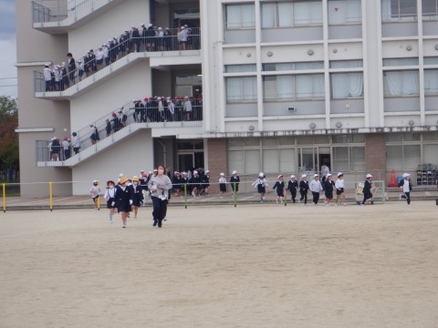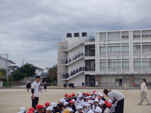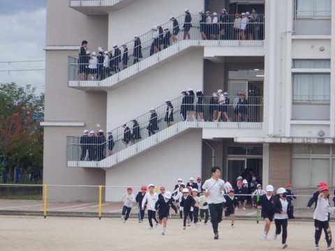 3・5年は屋外の階段を使って避難します。運動場に出たら,避難の場所まで走ります。