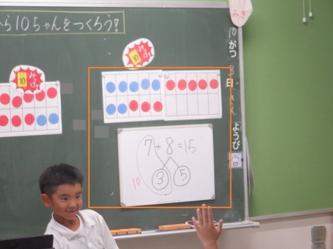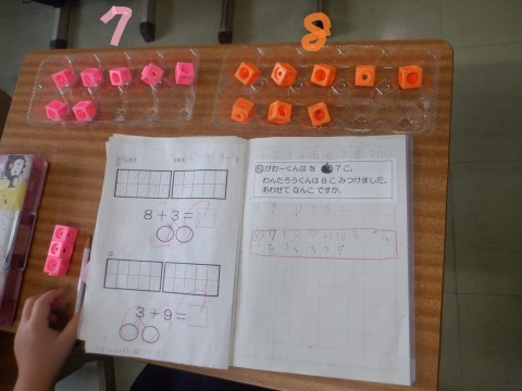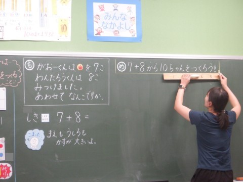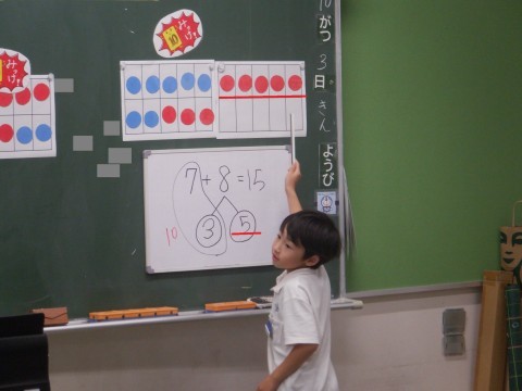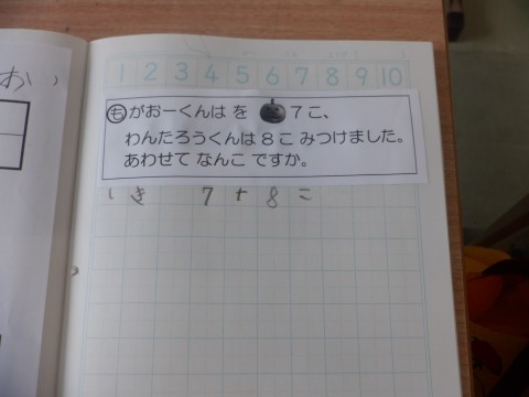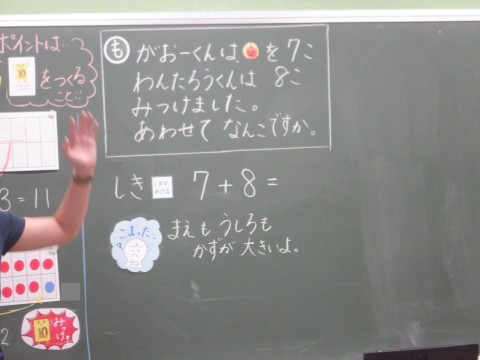 この問題の答えを求める式が7+8になることを確かめました。