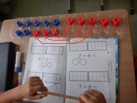 これまでの問題とちがって,たされる数,たす数とも10に近い数になっていることに気づきました。