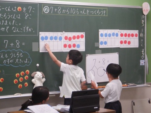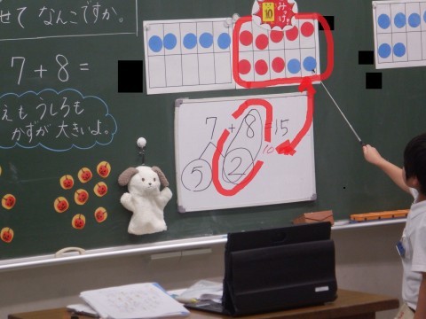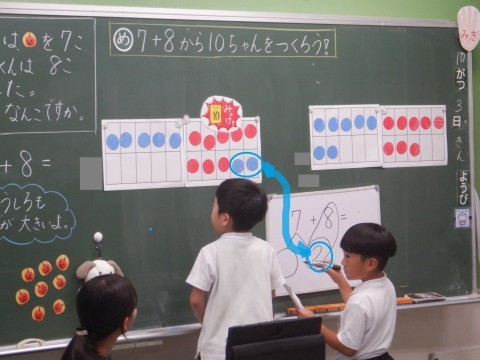 こちらは7+8の8を3と5に分け,その3を7と合わせて10を作っています。