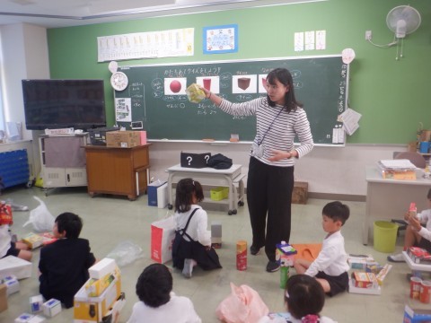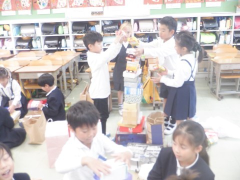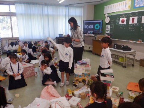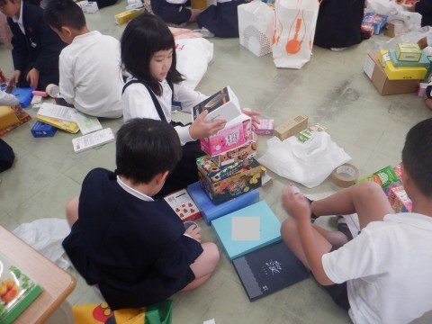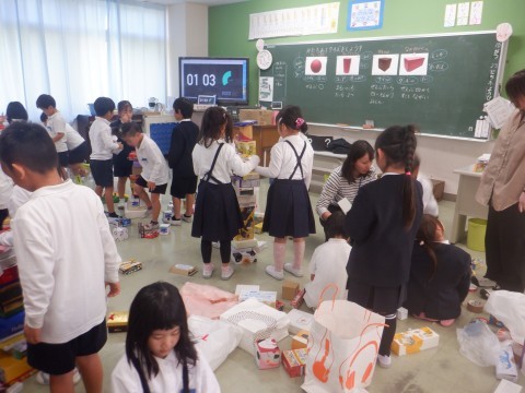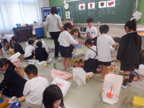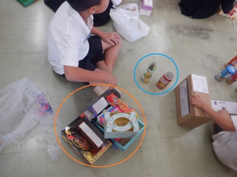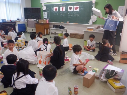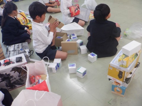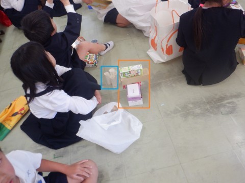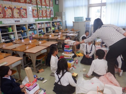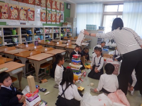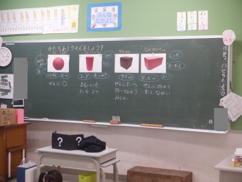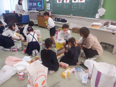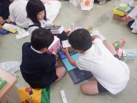 1年算数の学習です。はこを使って,立体についての学習をします。