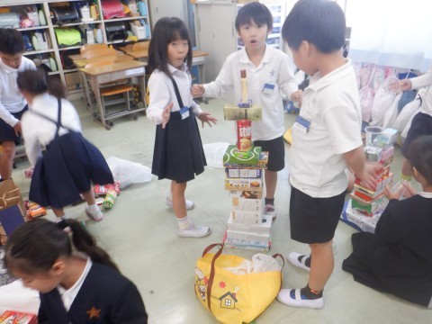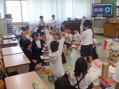 1mぐらいまで積み上げることができました。一番高く積み上げたグループに拍手を送りました。