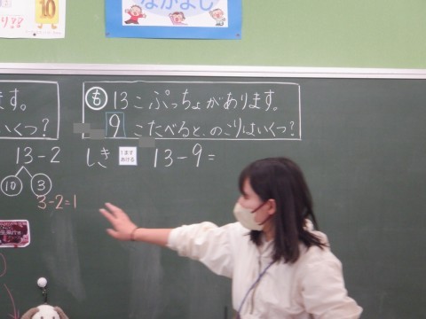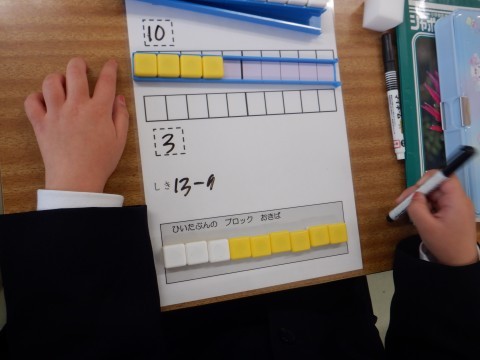 1年算数の学習です。繰り下がりのあるひき算の場面が問題になっています。