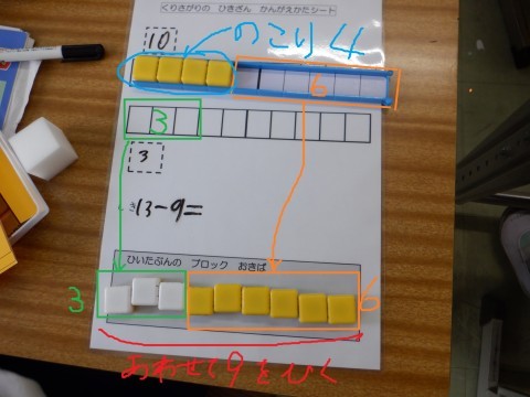さっそくブロックを操作して答えを求めました。この人は,13を10と3に分け,そのうちの10から食べる数の9をひいて答えを出しました。