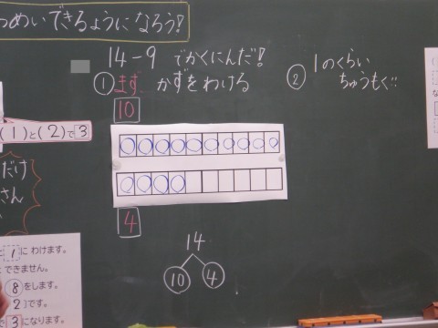 1年算数の学習です。ひき算の計算の仕方を説明できるようになろうとしています。このクラスの問題は14-9です。
