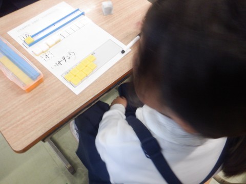 ラミネートしたワークシートにブロックを置き,これを操作して考えます。