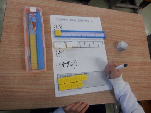 1年算数の学習です。ひき算の計算の仕方を説明できるようになろうとしています。このクラスの問題は14-9です。