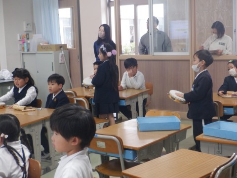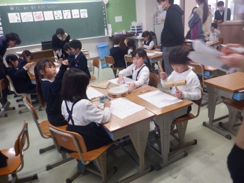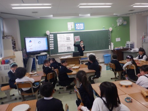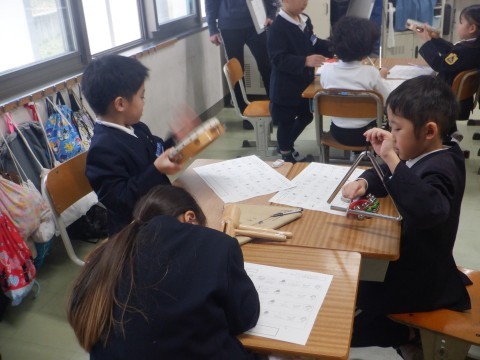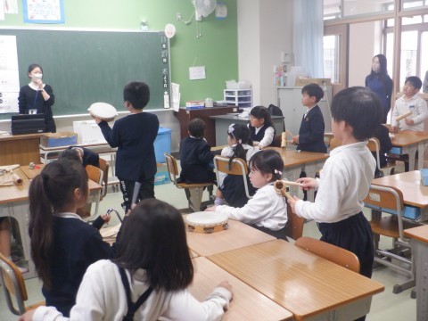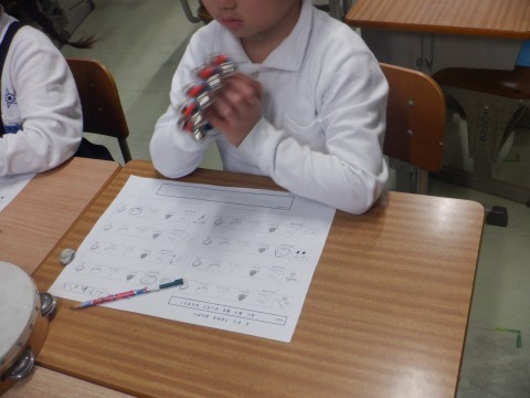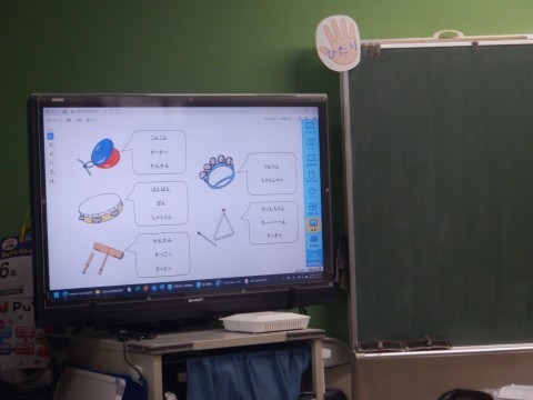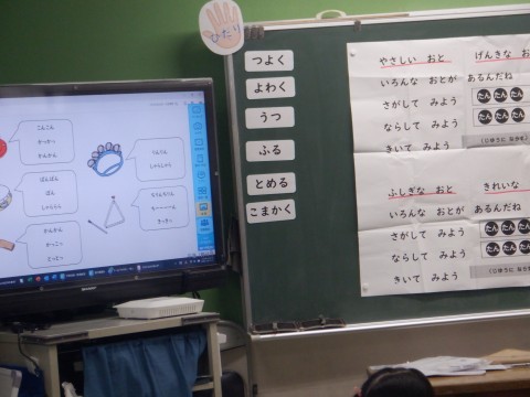 昨日の1年音楽の学習です。タンバリンやすずなどの楽器を使って,音をつくる学習をします。