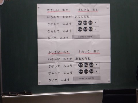 やさしい音,ふしぎな音,元気な音,きれいな音をそれに合った楽器や音の出し方で表しているところです。