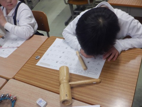 たたき方を変え,音を確かめながら,めざしている音に近づこうとしているようです。