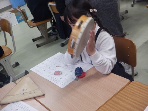 いよいよこの時間のメインの活動に入ります。これまで使ってきたカスタネット,タンバリン,ウッドブロック,すず,トライアングルという楽器と,「強く」「弱く」などの音の出し方の工夫を組み合わせて,「しゃんしゃん」「ぼーん」といった音を作っていきます。