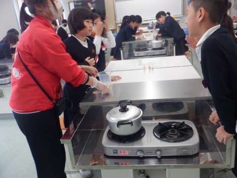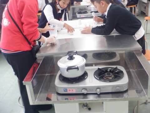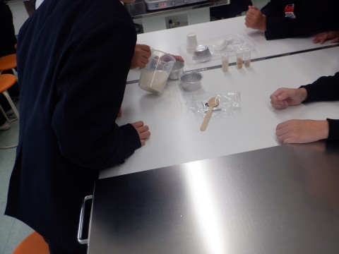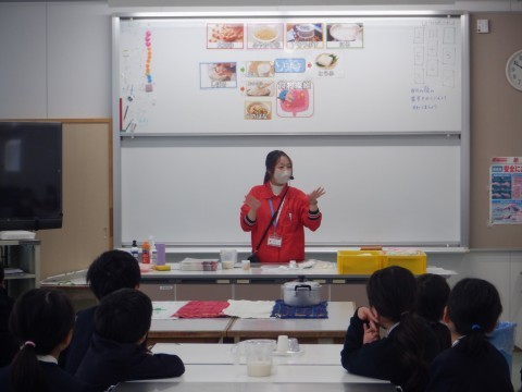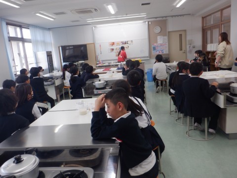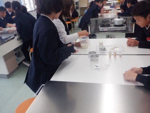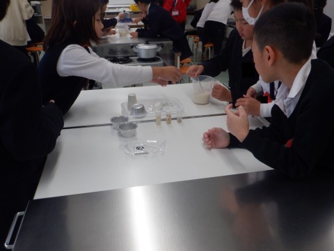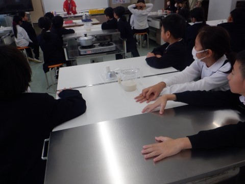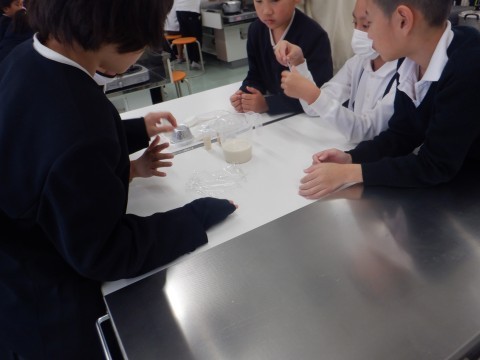 3年の出前授業の様子です。国語で「すがたをかえる大豆」を学習したことを受けて,実際に豆乳から豆腐をつくる体験をします。