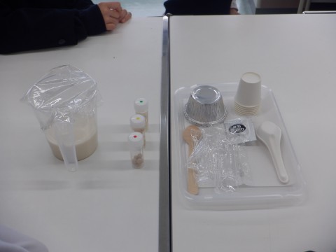 机の上には,豆乳やにがりなどの豆腐の材料などが用意されています。