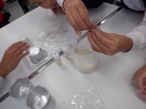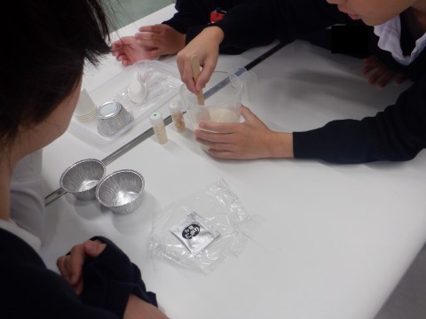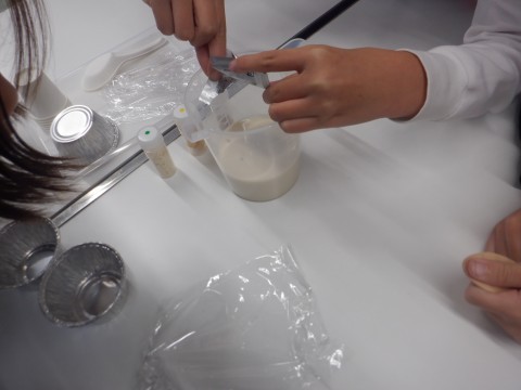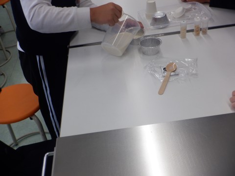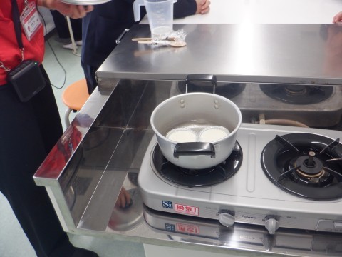 にがりを入れてよくかきまぜた豆乳を,加熱するため,アルミのカップに入れます。