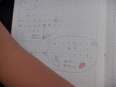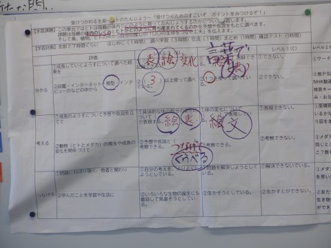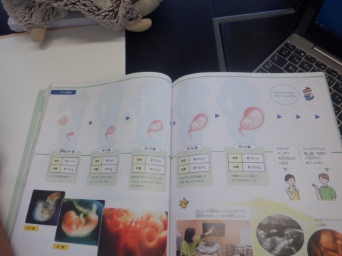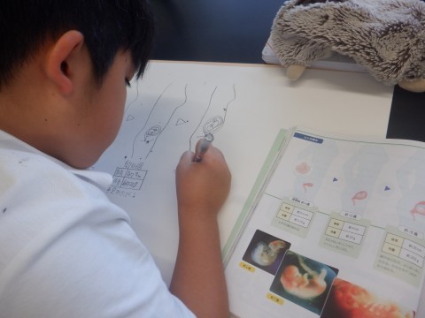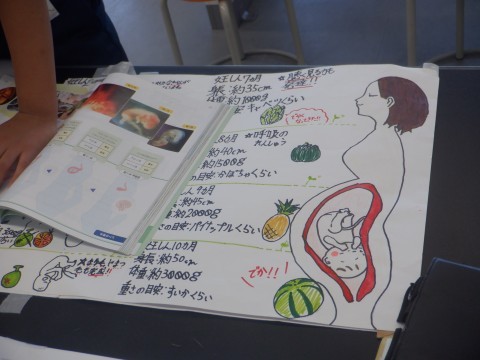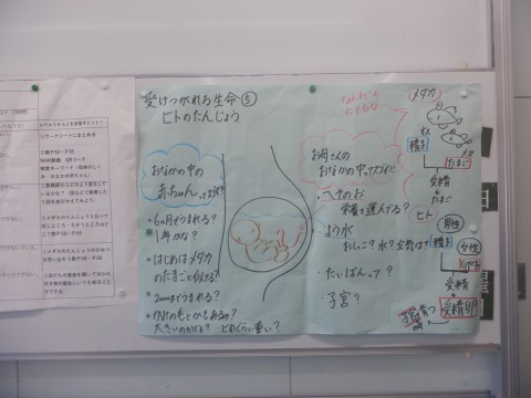 5年理科の学習です。人の誕生までを調べています。そして,これまでに学習した植物や動物を含めて,生命が受け継がれていくことについての考えをもつことがねらいです。