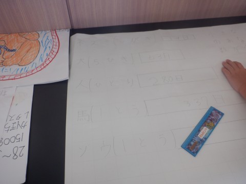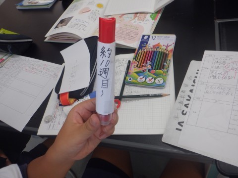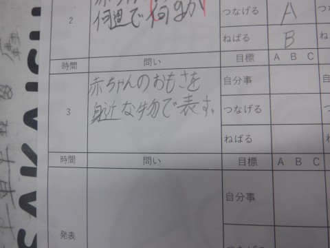 ヒトの赤ちゃんの重さの移り変わりを,身近にある同じ重さのもので表す工夫をしていこうと考えています。課題に向かった追究が進んでいます。