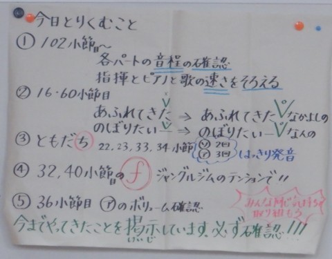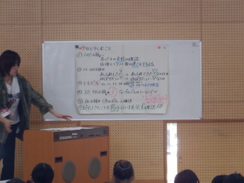練習の終わりには,各自が目標にしていたことができたのかどうか,近くの仲間と話し合いました。歌とともに,集団としても高まっています。