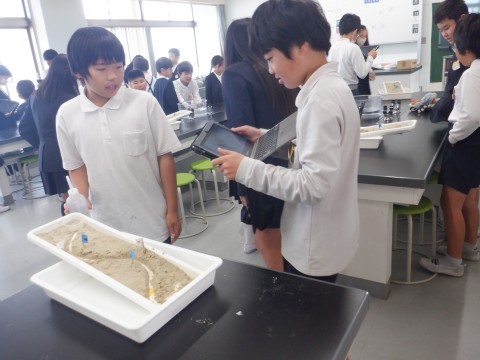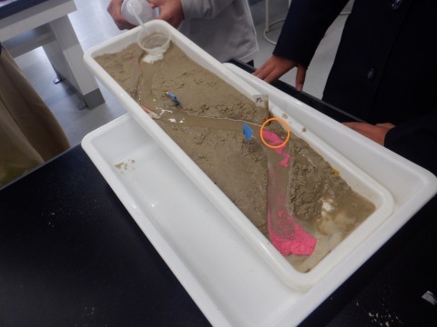 5年理科の学習です。川の模型を使って,流れる水のはたらきについて学びます。