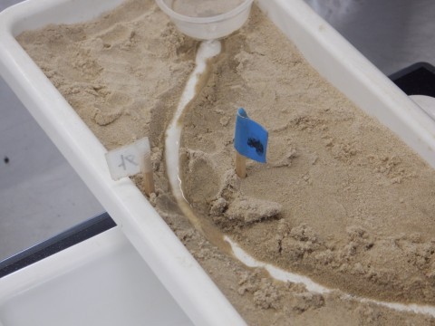 運ばれた砂は,最後は最も下流の「海」に堆積しました。結果は出ました。ここからさらに考察を深めていきましょう。