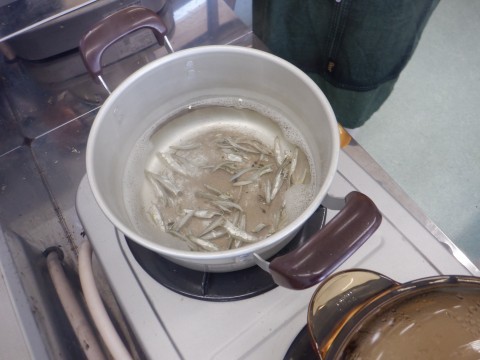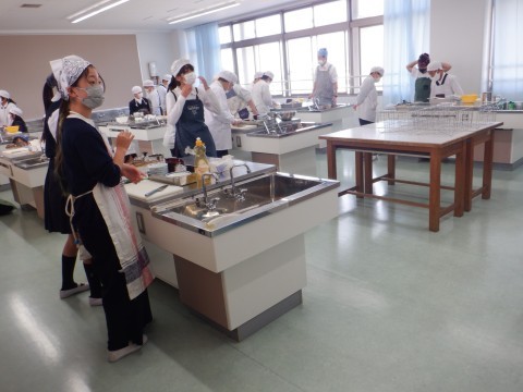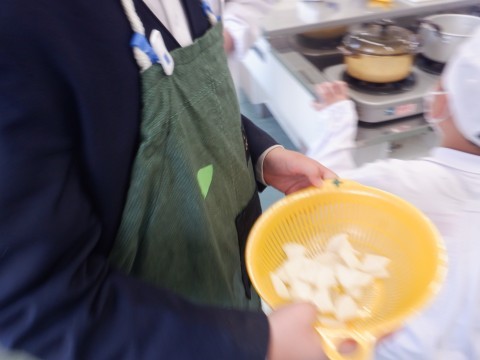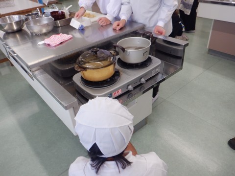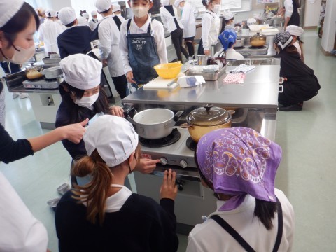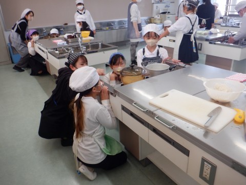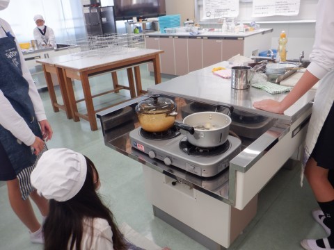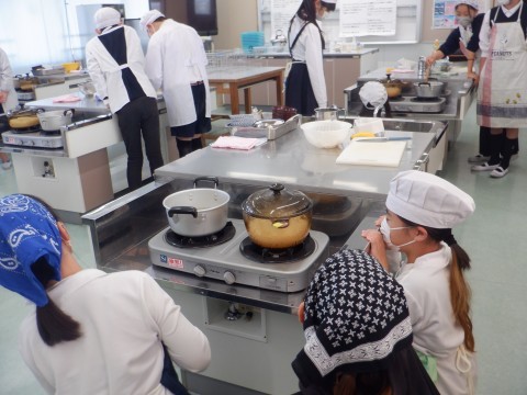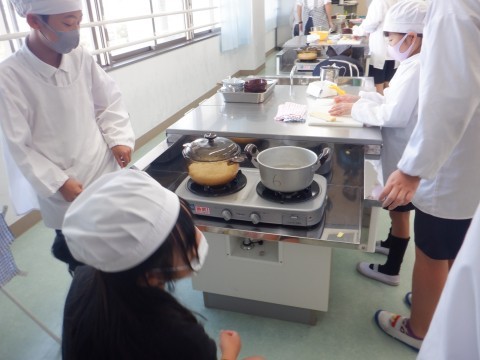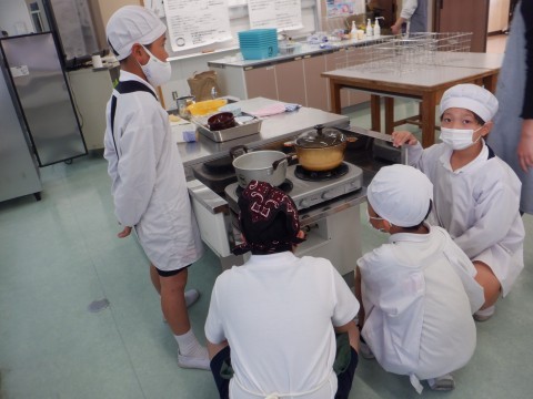 5年家庭科の学習の様子です。ごはんとみそ汁の調理実習です。米は自分たちが田植えや稲刈りを手伝って収穫したものを使っています。