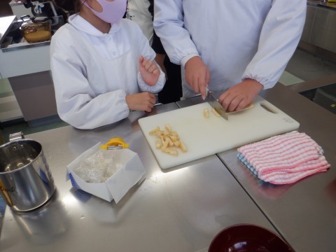 みそ汁に入れる具材の準備をしています。薄あげは短冊切り,大根はいちょう切りにしています。