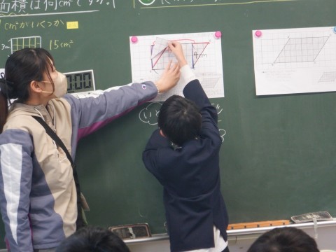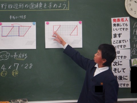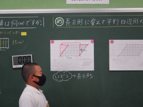 それぞれの考えを全体で交流しました。三角形を切り取って移動させる考え方を説明しています。