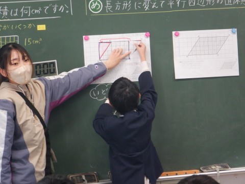 5年算数の学習です。平行四辺形の面積の求め方を考えます。