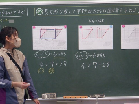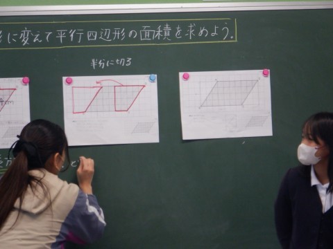 平行四辺形の一部を切り取って移動させることで,長方形に変換できるのではないか という考えが出てきました。