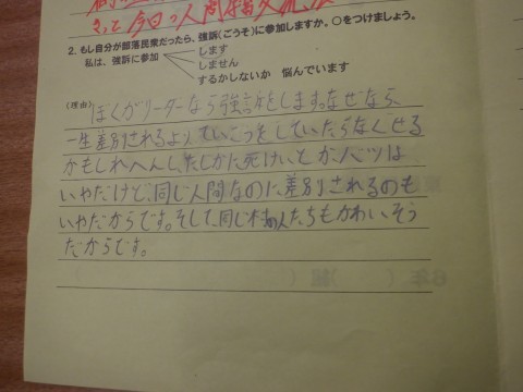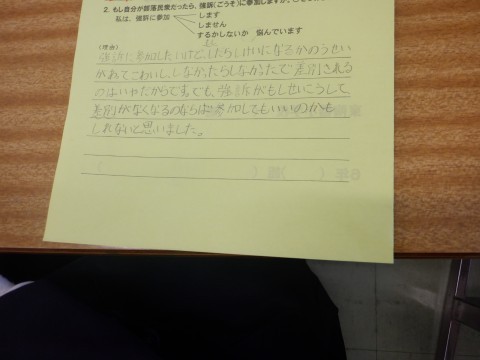「迷っている派」の人のワークシートです。強訴で差別がなくなるかもしれないという思いと,参加することのリスクとの間で「迷っている」ようです。
