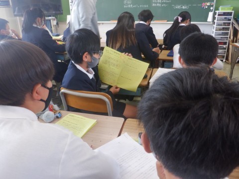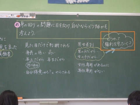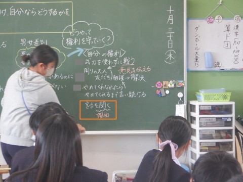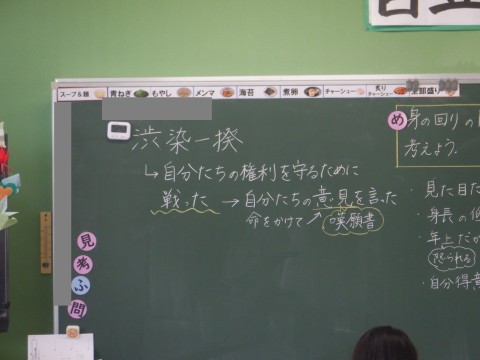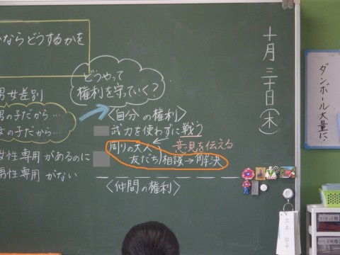 6年 にんげん学習交流会をめざしている6年生の昨日の様子です。渋染一揆そのものの学習は終わり,自分たちの身の回りの問題について考える段階に入っています。自分・自分たちの権利が侵されたときに,どうやってそれを守るのかを考えました。